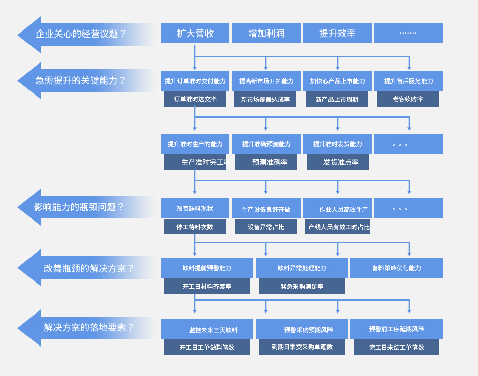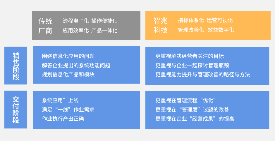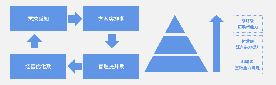 智兆将实现客户应用价值分为四个阶段,分别为需求感知期、方案实施期、管理提升期与经营优化期。在不同的周期,智兆通过提供相应的培训分享、指标量化、管理改善以及转型支撑等程序与手段,帮助企业经营者、管理层与使用人员体验价值服务,并提升各阶段不同的应用价值。将企业管理议题分解到战略层、运营层、管理层,贯穿企业各个层级,让每一层都有一个可被量化的执行指标,并且可以检核指标的达成状况。
